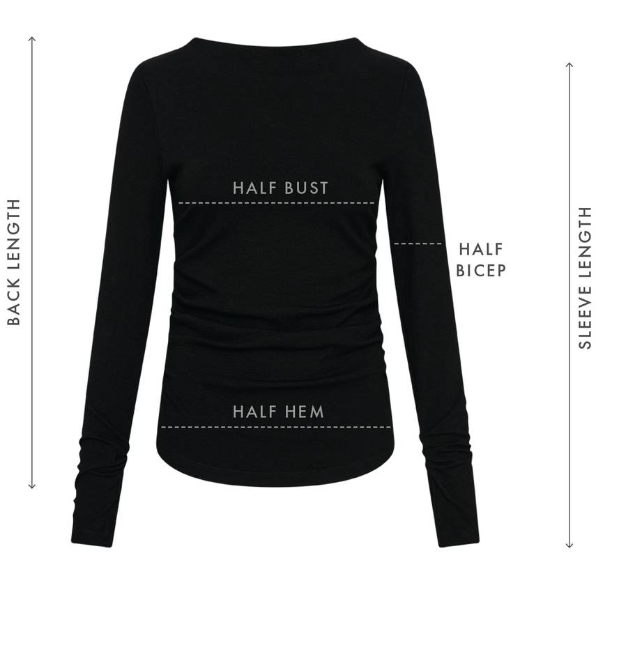 Inspired by 90s minimalism, the Longsleeve Harlow Top is the cool weather version of our best-selling Harlow Top. Streamlined in shape, the high boat neckline creates a sense of elegance, complete with gentle ruching along the seams of the body and sleeves.